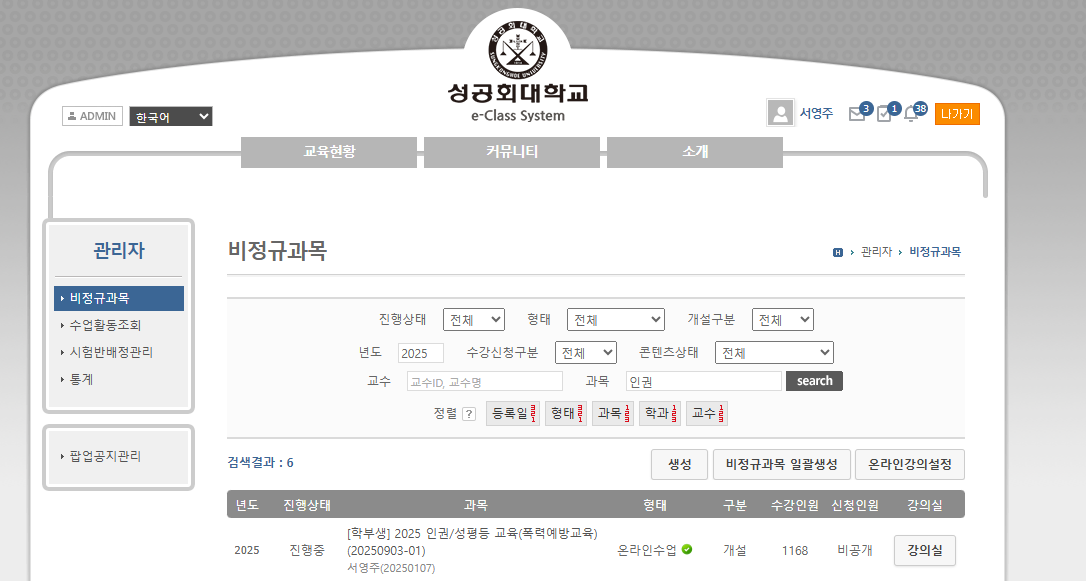 * LMS 로그인->우측 상단 이름 클릭->왼쪽 메뉴(수강과목) 클릭->비정규 과목->(학부생)2025 인권/성평등 교육(폭력예방교육)을