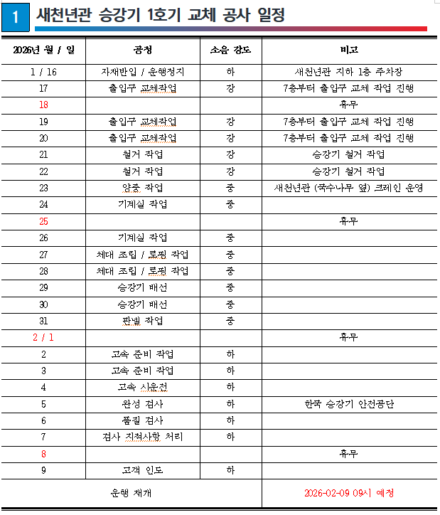 새천년관 승강기(1호기) 교체 공사 일정 안내