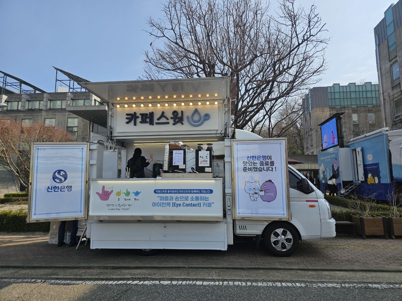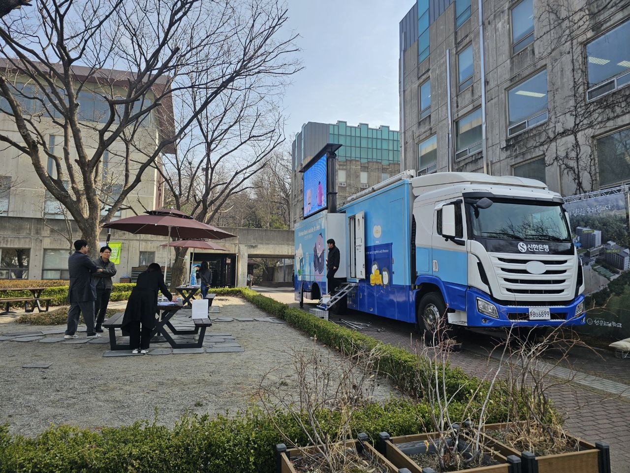 2. 신한은행에서 오늘 커피차를 운영합니다. 성공회대학교 재학생이라면 선착순 500명에 한하여 11:00~14:00까지 커피차를 자유롭게 이용해주시기 바랍니다.
